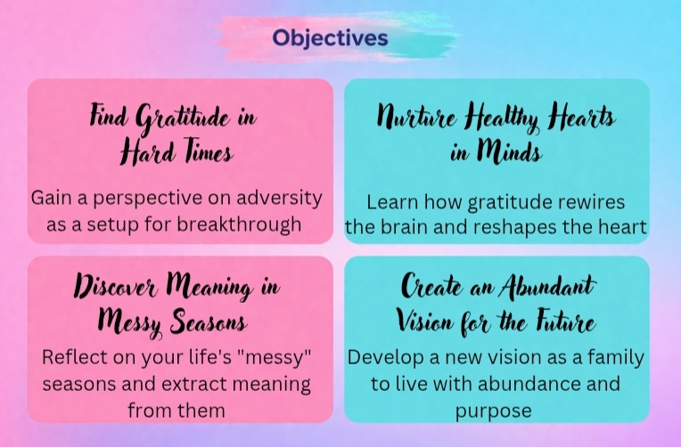 Participants will explore how gratitude can transform adversity into strength and help families grow together through life’s challenges. They will reflect on their own journeys, identify the lessons within difficult seasons, and discover ways to move forward with hope, purpose, and renewed perspective.