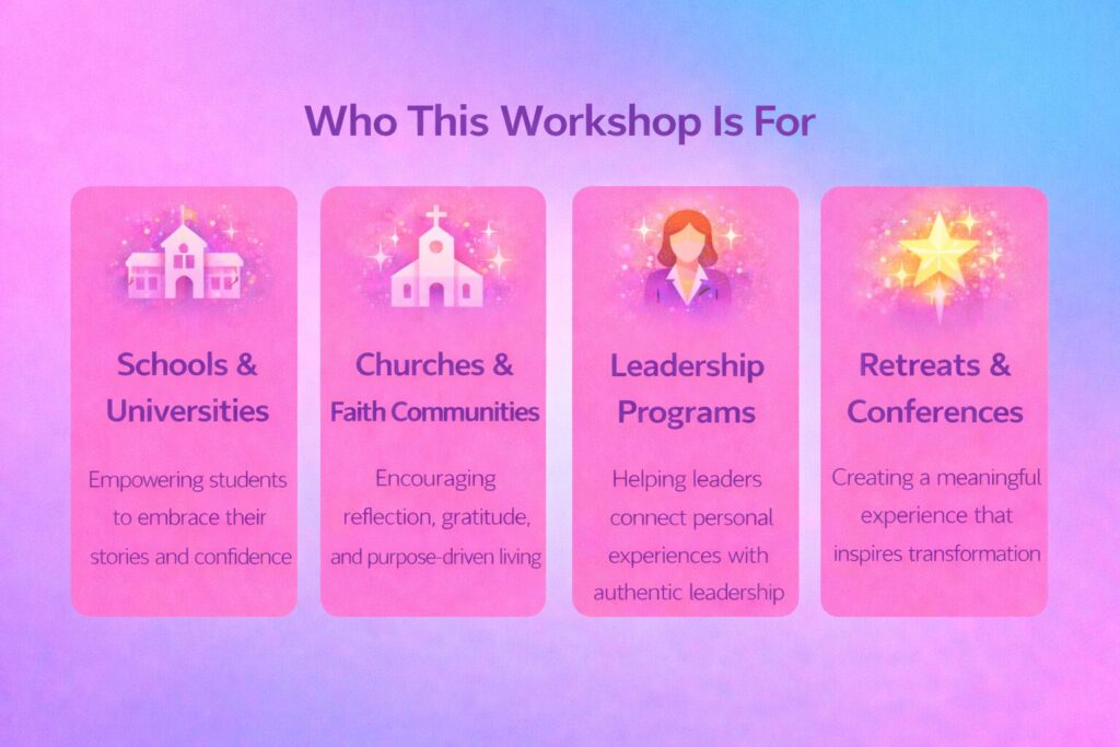 A powerful and reflective workshop that invites participants to transform life’s hardest moments into meaningful messages that inspire others. Through personal storytelling, gratitude, and reflection, participants discover how their experiences can become a source of hope, encouragement, and purpose.