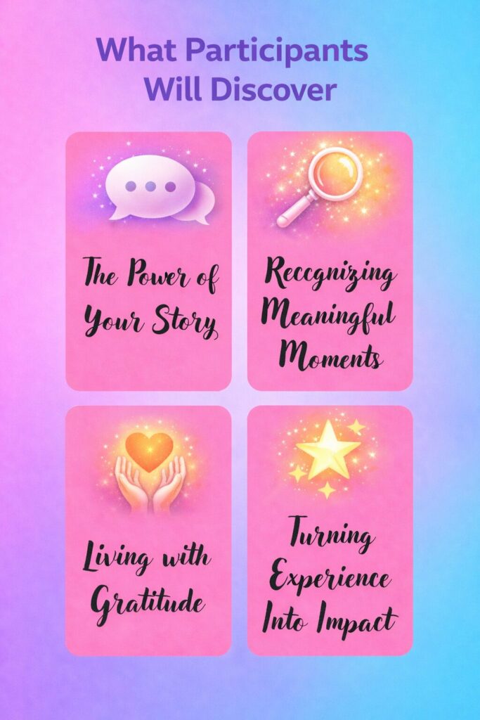 Life’s struggles hold powerful lessons—this workshop helps turn those experiences into meaning, growth, and inspiration for others.