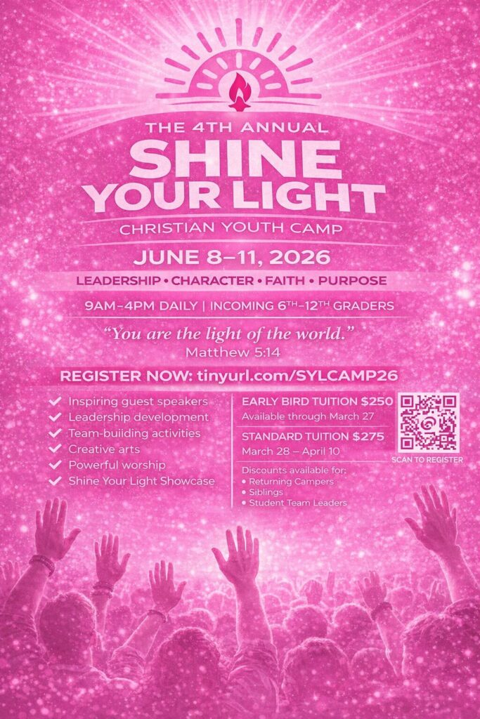 Shine Your Light Camp is a Christ-centered summer experience designed to help middle and high school students grow in faith, leadership, confidence, and character.