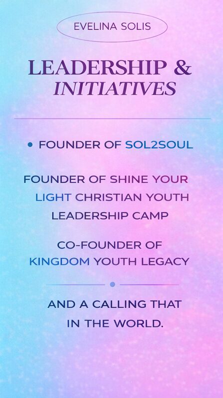 As the founder of Sol2Soul and Shine Your Light Christian Youth Leadership Camp, Evelina creates faith-filled spaces where youth don’t just learn — they rise. Through Christ-centered programs, mentorship, and leadership development experiences, she helps middle and high school students discover their voice, strengthen their character, and step boldly into their God-given purpose.